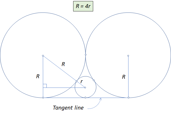 You can’t see any magic in the picture above until you see the picture below. When two big circles of equal radius, a small circle and a line are tangent to each other, you’ll find a 3-4-5 triangle, easy to approve it yourself.