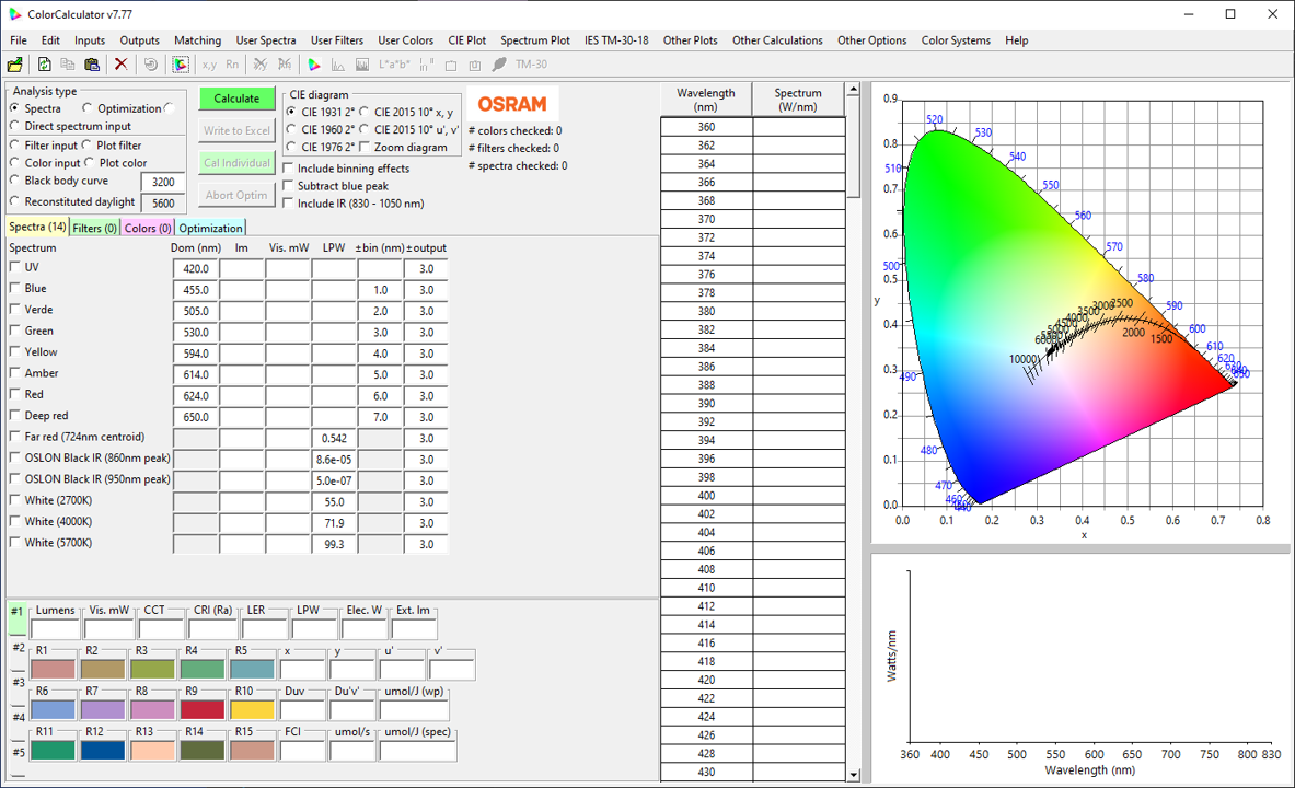 The ColorCalculator software is a standalone program developed by OSRAM to allow a user define a broad range of desired photometric values and a broad range of LEDs. Do you have a need to make your own CIE plots including MacAdam ellipses? This free tool makes the job done easily. Here is a screenshot.